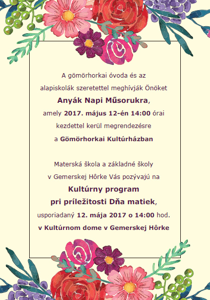 Materská škola a základné školy v Gemerskej Hôrke Vás pozývajú na Kultúrny program pri príležitosti Dňa matiek, usporiadaný dňa 12. mája 2017 o 14:00 hod. v Kultúrnom dome v Gemerskej Hôrke