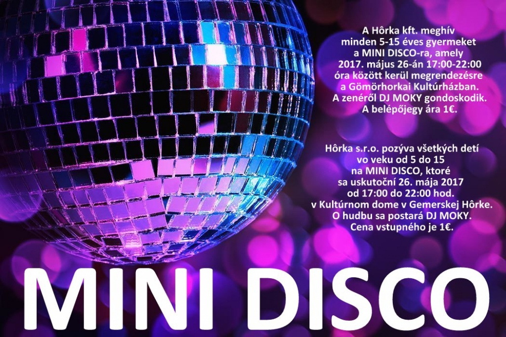 Hôrka s.r.o. pozýva všetkých detí vo veku od 5 do 15 na MINI DISCO, ktoré sa uskutoční 26. mája 2017 od 17:00 do 22:00 hod. v Kultúrnom dome v Gemerskej Hôrke. O hudbu sa postará DJ MOKY. Cena vstupného je 1€.