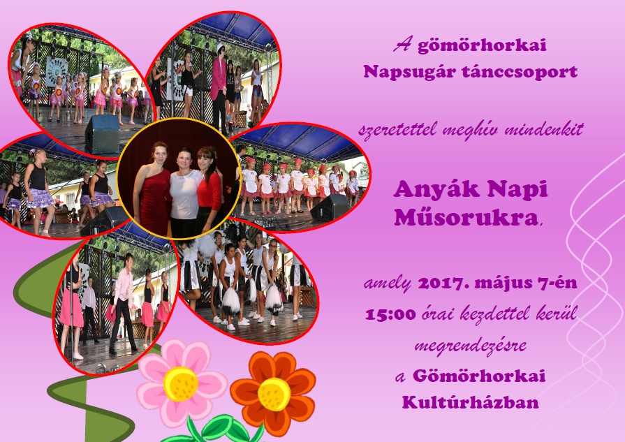 Tanečná skupina Napsugár Vás srdečne pozýva na vystúpenie pri príležitosti k Dňu matiek, usporiadané 7. mája 2017 o 15:00 hod. v Kultúrnom dome v Gemerskej Hôrke